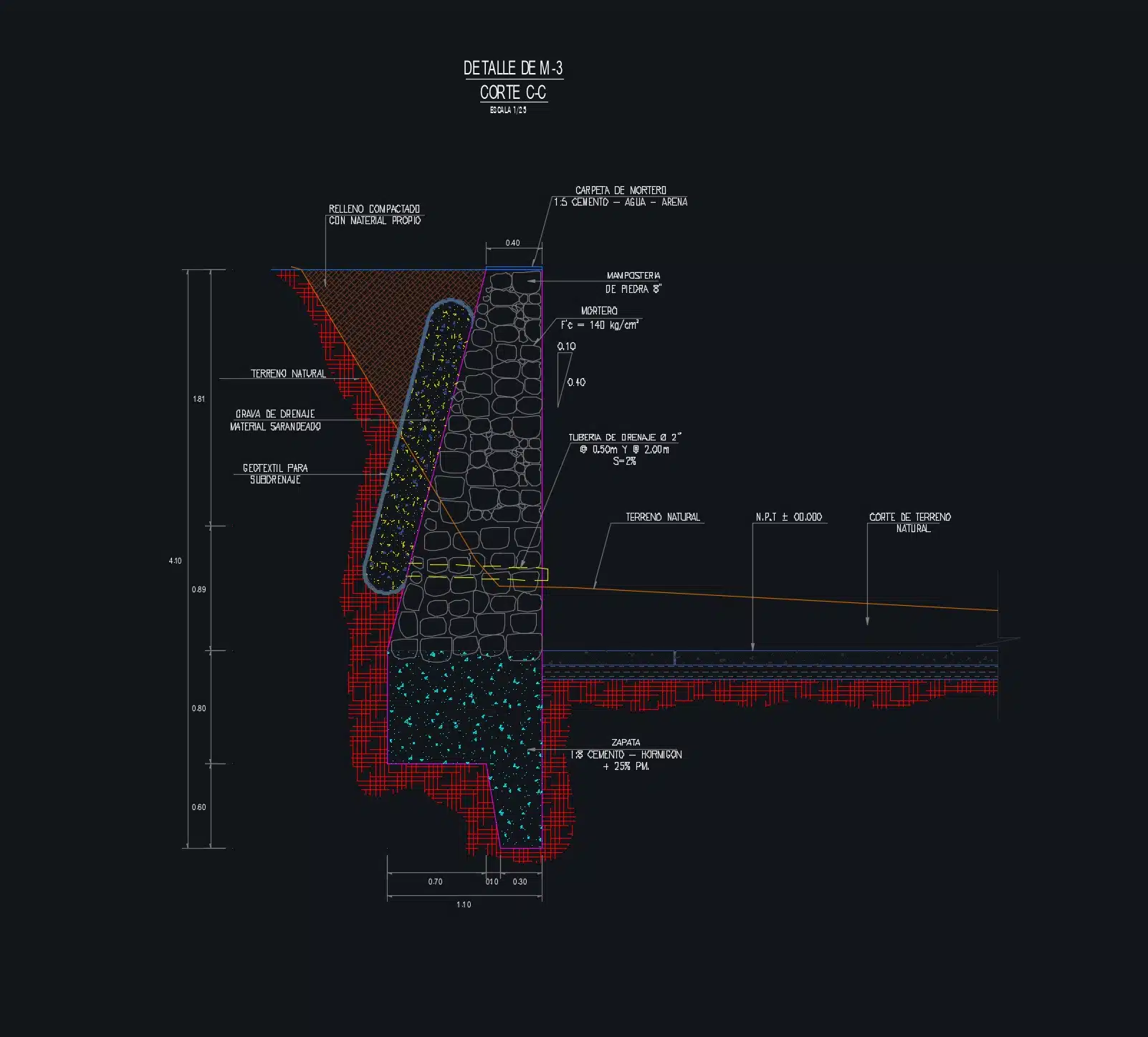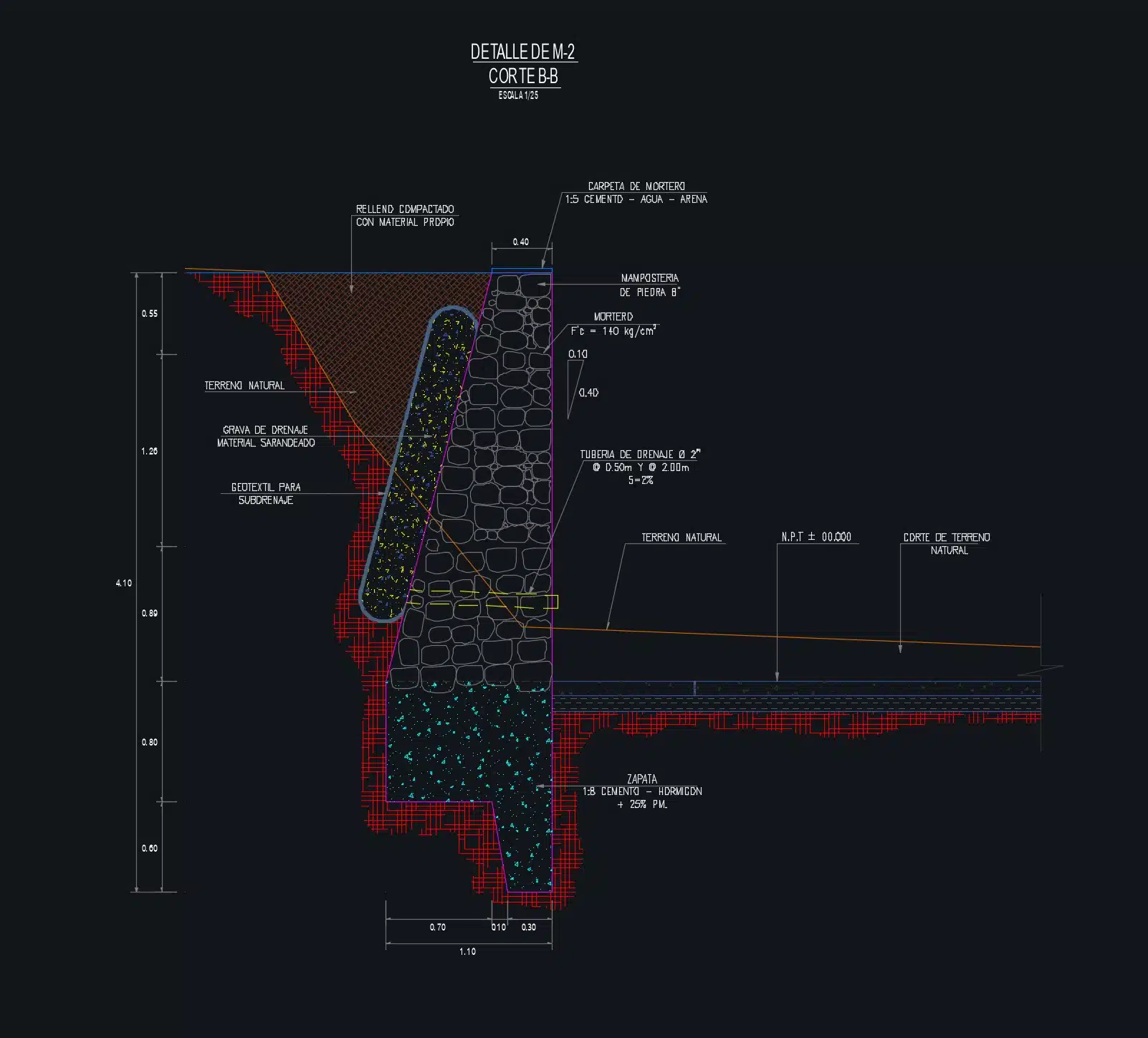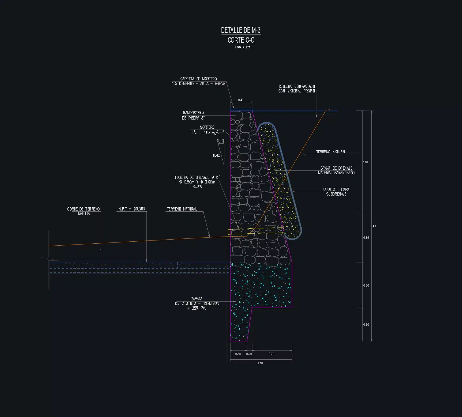 Este archivo ofrece un detalle técnico profesional de un muro de contención de mampostería, desarrollado con criterios constructivos correctos y pensados para obra real. El dibujo incluye todo el sistema estructural: desde la mampostería de piedra y la capita de mortero, hasta la zapata monolítica, el drenaje con grava seleccionada, el geotextil y la tubería perforada con su pendiente correspondiente.