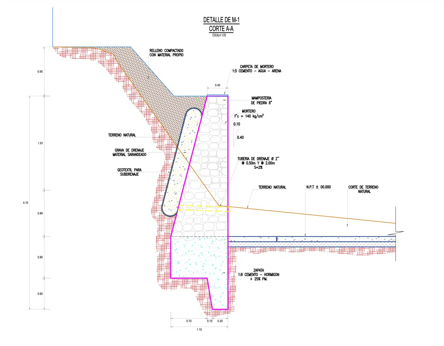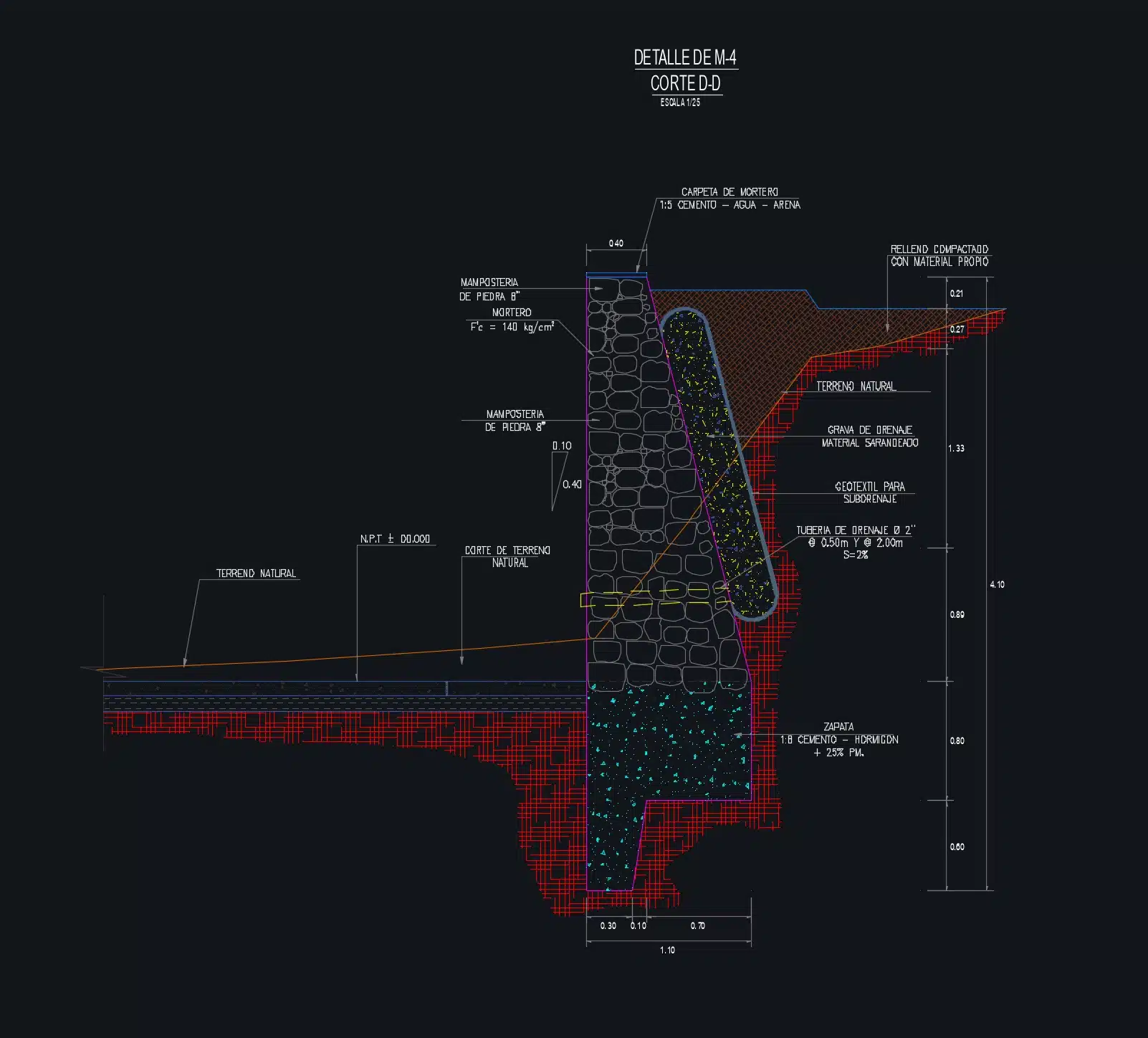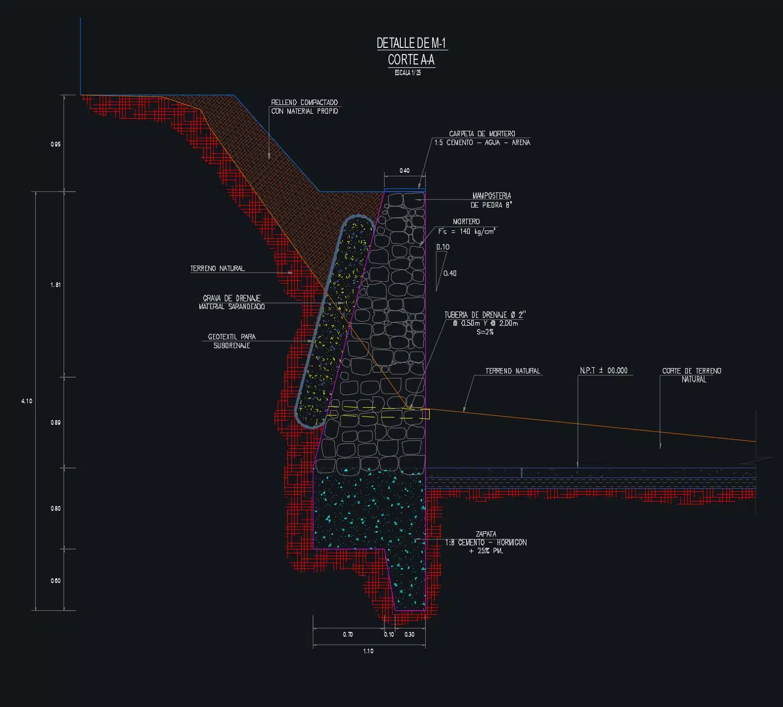 Este archivo ofrece un detalle técnico profesional de un muro de contención de mampostería, desarrollado con criterios constructivos correctos y pensados para obra real. El dibujo incluye todo el sistema estructural: desde la mampostería de piedra y la capita de mortero, hasta la zapata monolítica, el drenaje con grava seleccionada, el geotextil y la tubería perforada con su pendiente correspondiente.
